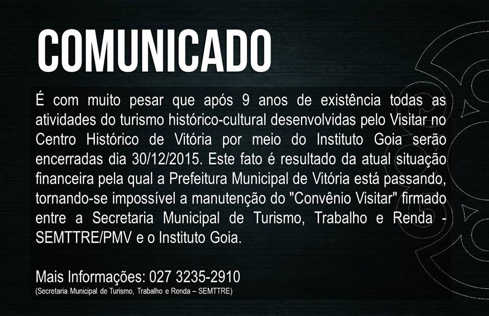 Atualização: a informação agora é que foi encerrado o convênio com o Instituto Goia, mas que a Prefeitura de Vitória irá reabrir os monumentos a partir do ano que vem.